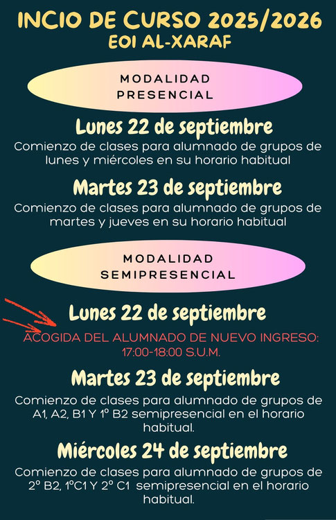 22 de septiembre: CAMBIOS DE GRUPO. Si no puedes asistir al grupo en el que te has matriculado, solicita un cambio a través de este formulario.